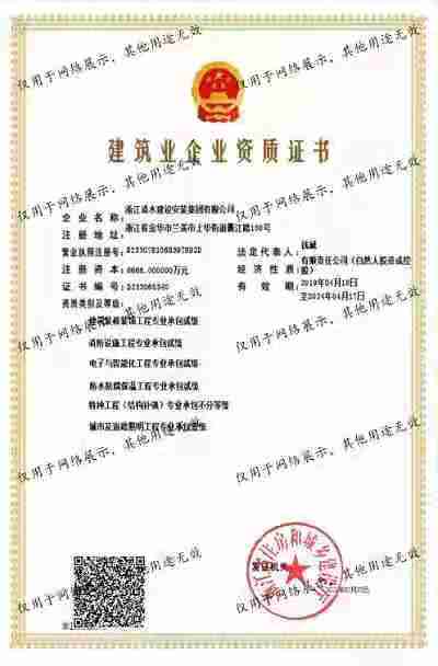 浙江清水建設安裝集團有限公司成立于2013年,注冊資金6688萬元。集團具有消防設施工程專業(yè)承包壹級、城市與道路照明專業(yè)承包壹級、電子與智能化專業(yè)承包壹級、建筑裝飾裝修專業(yè)承包貳級、防水防腐保溫專業(yè)承包貳級、市政工程施工總承包貳級、機電工程施工總承包貳級、建筑工程施工總承包貳級、電力工程施工總承包貳級、機電工程專業(yè)承包貳級、環(huán)保工程專業(yè)承包貳級、古建筑工程專業(yè)承包貳級、特種工程結構補強專業(yè)承包、建筑施工勞務作業(yè)專業(yè)承包(憑建筑業(yè)企業(yè)資質證書經營